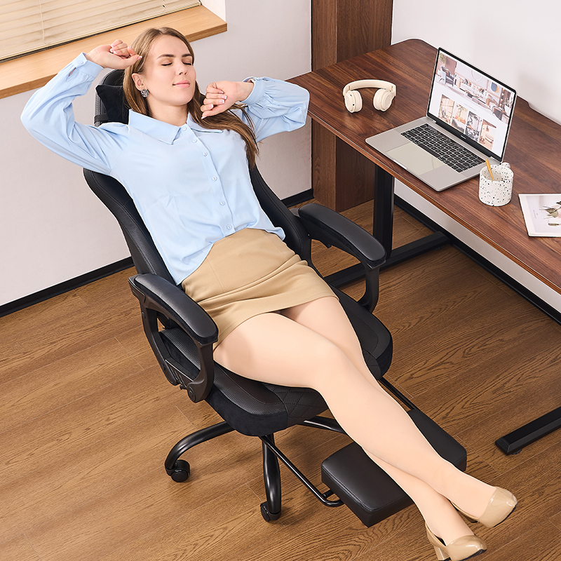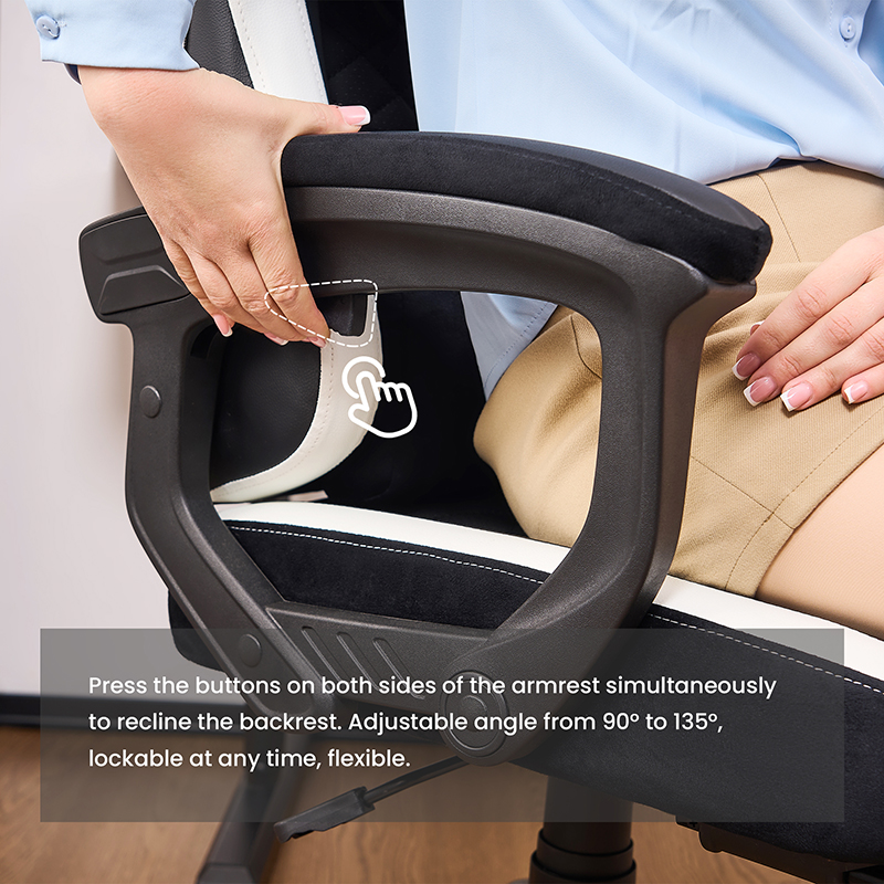 Kantelhoek van de rugleuning van de stoel: De rugleuning van de stoel moet de kantelhoek kunnen aanpassen om verschillende zitopties en ontspanningsmethoden te bieden, en de natuurlijke rugcurve te ondersteunen.